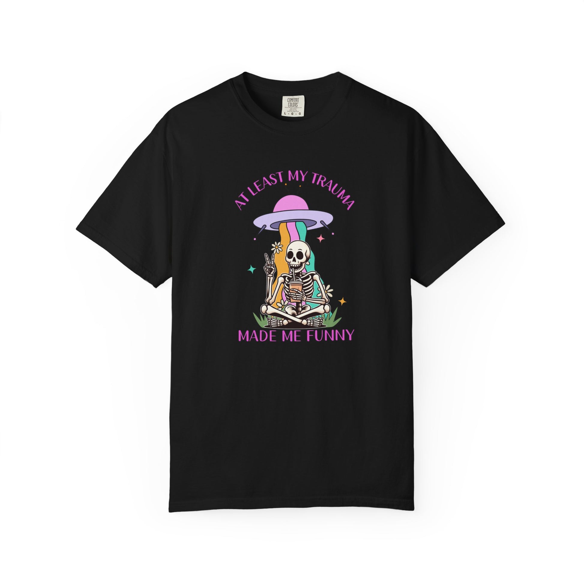 Featuring a peace-sign-throwing skeleton and a rainbow UFO abduction, the At Least My Trauma Made Me Funny tee is for the chronically coping with impeccable comedic timing.